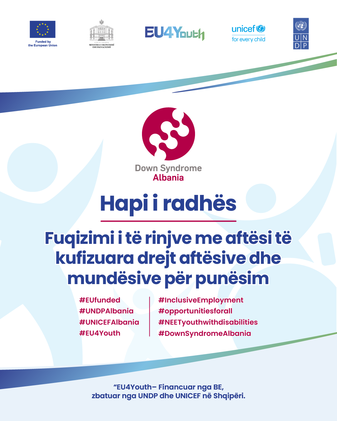 Projekti zbatohet nga Fondacioni Down Syndrome Albania në kuadër të projektit BE për Rininë, financuar nga Bashkimi Evropian, dhe zbatuar nga UNDP dhe UNICEF në Shqipëri në bashkëpunim me Agjencinë Kombëtare të Punësimit dhe Aftësive dhe Agjencinë Kombëtare të Rinisë, nën koordinimin e Ministrisë së Ekonomisë dhe Inovacionit.